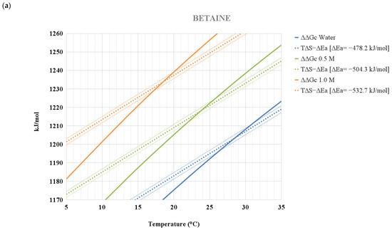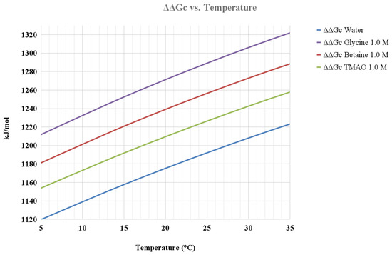 To reach a quantitative agreement, it is important to recognize that the stabilizing effect of ΔΔGc is counterbalanced by the destabilizing effect of the ΔEa contribution; this is a large and negative quantity in water, the magnitude of which should rise on adding the three co-solutes because the molecules of the latter can be involved in attractive interactions with the ELP surface [12,13,23]. Robust estimates of the ΔEa contribution are very difficult to obtain using theoretical relationships and/or computational procedures because one would need: (a) reliable ensembles for both the G-state and the C-state of ELP, which is a chain of 600 residues; and (b) good force-fields to describe the interactions of the three co-solutes with both the ELP surface and the water molecules. In contrast, the simple approach outlined to arrive at an estimate of ΔEa at T(collapse) in water (please, see Equation (6)) is feasible and should produce values with internal consistency (any possible error should be more or less of the same entity in all three cases). These ΔEa estimates are listed in the last column of Table 1.