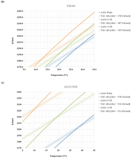 Moreover, they are assumed to be temperature independent in view of the small temperature range over which ELP collapse occurs in the considered aqueous solutions [4] (remember that it is the ΔHreorg term to be strongly temperature dependent [33,55]). This assumption allows the drawing of the T·ΔSconf − ΔEa straight lines that cross the ΔΔGc functions at T(collapse); see Figure 5, panel (a) for betaine aqueous solutions, panel (b) for TMAO aqueous solutions, and panel (c) for glycine aqueous solutions. Actually, the straight lines drawn in Figure 5 also account for a very small uncertainty of 0.01 J K−1 molres−1, associated with ΔSconf(res), to further emphasize the sensitivity of the model results to this parameter. The numbers in the last column of Table 1 indicate that the ΔEa quantity increases in magnitude with the addition of the considered co-solutes to water. This finding makes sense because the molecules of TMAO, glycine, and betaine can all be involved in attractive interactions (i.e., both dispersion interactions and H-bonds) at the ELP surface, and the latter should markedly increase upon swelling of the polypeptide chain. There are quantitative differences among the three co-solutes, but they cannot be taken for granted in view of the simplicity and roughness of the procedure used to arrive at the ΔEa estimates. However, it is important to underscore that preferential interaction (i.e., enrichment) and preferential exclusion (i.e., depletion) are expressions used to describe thermodynamic data referring to differences between conformations belonging to two huge ensembles (i.e., the two macro-states) and cannot be taken literally [56,57,58]. The expectation is that polymer chains possessing both polar and nonpolar moieties, such as PNIPAM and ELP, are attractive for water molecules (indeed, they are soluble in water at low temperature) and for the molecules of TMAO, glycine, and betaine. In fact, MD simulations by Berne and co-workers demonstrated that TMAO molecules, similarly to urea molecules, are enriched at the surface of hydrophobic polymers [59,60]. This reasoning implies that the surface of ELP chains is covered by water and co-solute molecules. Note that the MD results by Cremer and co-workers were obtained not for an ELP chain but for a single Val-Pro-Gly-Val-Gly peptide [4]. To address these matters, it is mandatory to perform MD simulations on polymer chains since the surface area magnitude is a critical factor [61], and additivity might not hold in these cases. Nevertheless, polymer collapse does occur when the translational entropy gain of water and co-solute molecules, associated with the decrease in solvent-excluded volume, overwhelms the other contributions in the Gibbs free energy balance of Equation (4).