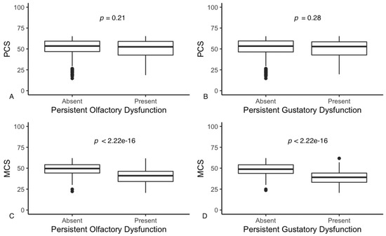 The presence of at least one persistent symptom was shown to be related to significantly lower PCS and MCS values compared to respondents who resolved all symptoms >6 months after COVID-19 diagnosis. In particular, all symptoms that affect the respondent’s ability to carry out physical activities normally (i.e., fatigue, dyspnea, muscle and joint pain) were associated with a significant reduction in PCS. POD and PGD were instead accompanied by a significant reduction in MCS alone. Such a reduction in the mental component of QoL is greater than that reported for pathologies, such as chronic renal failure requiring long-term dialysis [80], chronic ischemic heart disease [81] and oncological problems [82]. The strength of the relationship between POD or PGD and MCS is underlined by the strong and significant relationship detected between self-reported VAS assessment of smell and, marginally, of taste and MCS values, the net effects of age, sex and the duration of the disease (Figure 2).