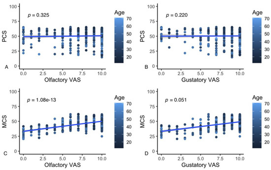Results of the correlation analysis between olfactory and gustatory VAS scores and PCS (A,B) and MCS (C,D).
