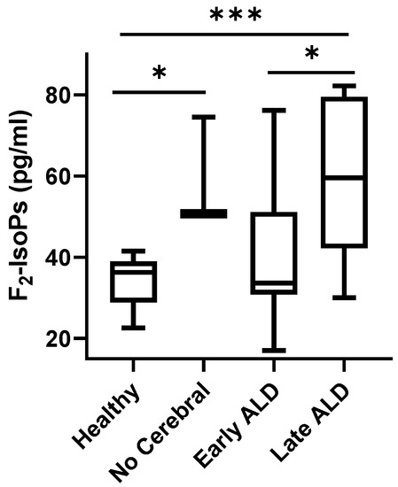 F2-IsoP plasma levels in ALD patients. Data are expressed as medians (columns), bars are minimum and maximum, and boxes represent inter-quartile ranges (25th–75th percentiles). Asterisks indicate significant pairwise tests (multiple comparison ordinary one-way ANOVA); * (0.01 ≤ p ≤ 0.03); *** p = 0.0001. Legend: healthy, healthy control group; no cerebral, confirmed ALD diagnosis but lack of cerebral disease; early ALD, ALD with cerebral disease in early period post-HSCT and on N-acetyl-L-cysteine (NAC) treatment; late ALD, ALD with cerebral disease in late period post-HSCT and off NAC therapy.
