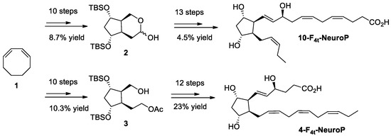 In brief, the two key bicyclic intermediates, 2 and 3, were obtained in 10 steps, yielding 8.7% and 10.3%, respectively. The introduction of α and ω chains were performed by using regioselective protections/deprotections, oxidations, Wittig elongation, and cross metathesis coupling reactions as the main steps for the 10-F4t-NeuroP [47]. The final step was the saponification of the methyl esters in the presence of LiOH to obtain free acids. The 4-F4t-NeuroP was obtained starting from intermediate 3 in 12 more steps of synthesis, giving 23% yield after optimizations, while 10-F4t-NeuroP and its C10-epimer were obtained in 13 steps from the intermediate 2 [46].