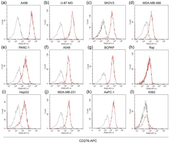 B7-H3 is highly expressed in various human carcinomas. To analyze B7-H3 expression on cell lines surface, we characterized human tumor cell lines from different tumor systems using flow cytometry. As shown in Figure 1a–l, most of the solid tumor cell lines showed a high expression of B7-H3 (A498, U-87 MG, SKOV3, A549, BCPAP, and MDA-MB-231); however, the hematoma tumor cell lines (K562 and Raji) showed low B7-H3 expression. On the surface of Raji cells, B7-H3 expression is almost negative.