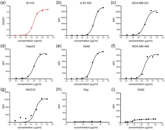 Anti-B7-H3 antibody 10-2#c shows high binding activity to B7-H3 and cell lines with high B7-H3 expression. (a) The binding of 10-2#c to human B7-H3 reconstituted protein was evaluated by ELISA (n = 3), EC50 = 2.216 ng/ml; (b–i) The binding of 10-2# to cell lines (U-87 MG, MDA-MB-231, HepG2, A549, MDA-MB-468, SKOV3, Raji, and K562) was detected by flow cytometry. MFI, median fluorescence intensity. MFI values (control/maximum concentration of 10-2#c) of these cell lines were, respectively, 834/93,630, 366/19,477, 353/16,980, 144/9385, 245/8215, 250/12,400, 125/136, and 140/646.