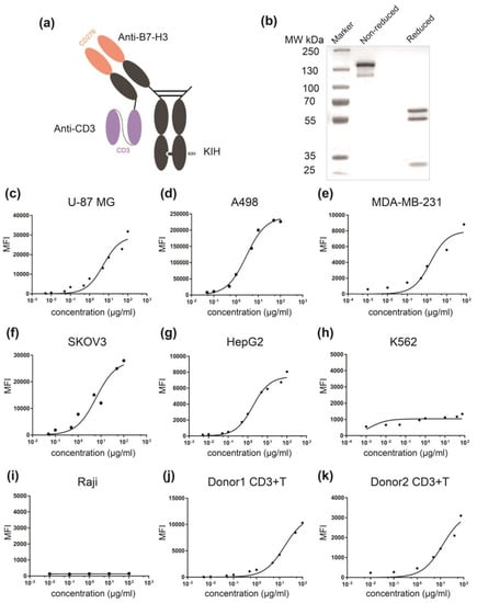 Generation and characterization of αB7-H3/CD3 bispecific antibody. (a) An illustrative representation of the αB7-H3/CD3 format. The format comprised an anti-CD3 scFv fused to light chain of a monovalent anti B7-H3 via a (G4S)3 linker; (b) Coomassie blue-stained SDS-PAGE analysis of purified αB7-H3/CD3 containing three chains with the following molecular weights: 57, 55, and 28 kDa; (c–k) αB7-H3/CD3 bispecific antibody dose-dependently binds to B7-H3+ tumor cells and CD3+ T cells, evaluated using flow cytometry. MFI values (control/maximum concentration of 10-2#c) of these cell lines were, respectively, 205/31,800, 7500/226,444, 480/5700, 350/27,950, 150/8065, 480/1550, 125/155, 50/10,300, and 195/3100.