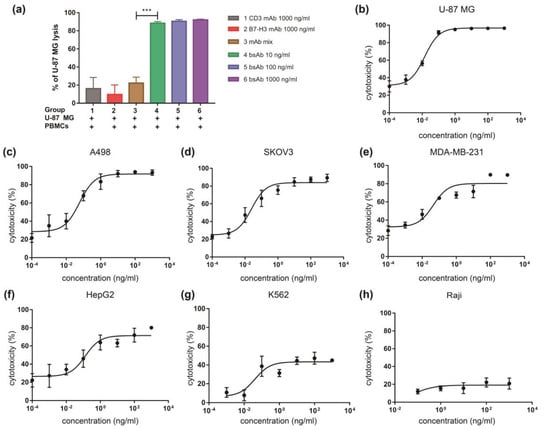 αB7-H3/CD3 mediates T cell cytotoxicity against B7-H3 expressing tumor cells in vitro. (a) Cytotoxic activity of PBMCs in U-87 MG cells mediated by αB7-H3/CD3 or other antibodies was measured by flow cytometry. n = 3, p-value for mAb mix vs. bsAb: *** p < 0.001; (b–h) αB7-H3/CD3 demonstrated cytotoxic activity against multiple tumor cell lines (U-87 MG, A498, SKOV3, MDA-MB-231, HepG2, K562, and Raji) with various levels of B7-H3 expression, E:T = 10:1. n = 3, mAb mix, anti-CD3 and anti-B7-H3 mAb mixture; bsAb, αB7-H3/CD3.
