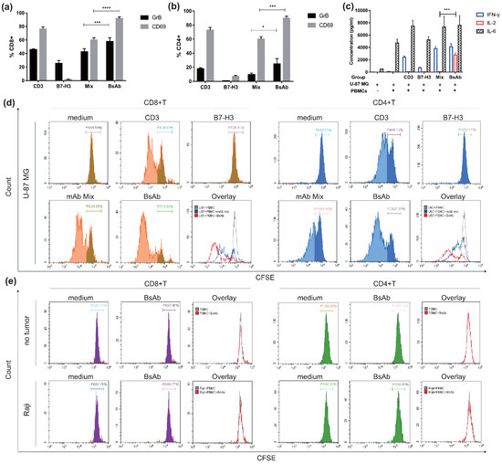 The potency of αB7-H3/CD3 to mediate T cell activation was examined by activation markers (CD69 and cytotoxic granule granzyme B (GrB) expression and cytokine production. Anti-CD3 mAb was used as a positive control. Additionally, since B7-H3 is an immune checkpoint molecule, we wanted to explore whether this anti-B7-H3 mAb could play the role of immune checkpoint blockade. As shown in Figure 5a,b, αB7-H3/CD3 activated CD8+ and CD4+ T cells to a similar extent as anti-CD3 mAb. Anti-B7-H3 mAb had little effect on T cell activation. As shown in Figure 5c, αB7-H3/CD3 mediated significantly more abundant production of IL-2 compared to anti-CD3 mAb or/and anti-B7-H3 mAb. Figure 5d showed that the anti-B7-H3 mAb did not induce T cell proliferation and demonstrated that αB7-H3/CD3 had a stronger effect on induction of both CD8+ (left) and CD4+ (right) T cell proliferation compared to anti-CD3 mAb and mAb mix. Additionally, when we replaced U-87 MG with no tumor or Raji, αB7-H3/CD3 did not induce T cell proliferation, which indicated that this effect was associated with the expression of B7-H3 (Figure 5e). These results confirmed that αB7-H3/CD3-mediated activity was accompanied by T cell expansion and activation, and its effect on T cells was B7-H3-dependent. Moreover, αB7-H3/CD3 had a stronger effect on the activation and proliferation of CD8+ T cells than CD4 + T cells.