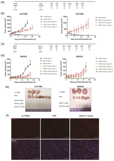 NCG mice (6–8 weeks old) were intravenously (i.v.) inoculated with 8 × 106 huPBMCs via the tail vein approximately 2 weeks before 5 × 106 U-87 MG/SKOV3 cells were subcutaneously (s.c.) transplanted into mice [48]. When tumor volume was about 150 mm3, U-87 MG xenograft bearing mice were randomized into six groups (no PBMC, PBS, αB7-H3/CD3 (0.2, 1, and 5 mg/kg) and anti-B7-H3 mAb 10-2#c (5 mg/kg)). SKOV3 xenograft bearing mice were randomized into four groups (no PBMC, PBS, and αB7-H3/CD3 (0.2 and 1 mg/kg)). Drugs were intraperitoneally (i.p.) injected twice per week. The bodyweight of mice and length (mm) and width (mm) of tumors were monitored every 2 or 3 days. Tumor volume (mm3) was calculated as Length × Width2 × 1/2. When the average tumor volume exceeded 1500 mm3, mice were euthanized.