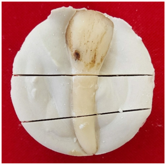 Figure 1. Sectioned bovine incisor fixed in alabaster plaster.