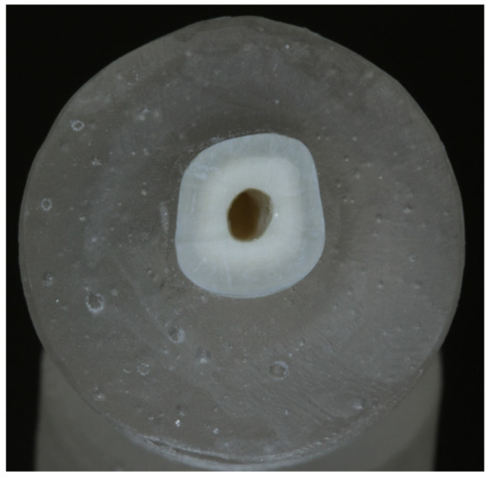 Both halves were then removed from the plaster and root blocks were created. The root canals of these root blocks were shaped with Gates-Glidden drills No. 1–6 (ISO 50-ISO 150, diameter 0.5–1.5 mm). The common rotary endodontic instruments were not suitable for instrumentation of the large-diameter bovine root canal, since the largest instruments in the sequence have their diameter at the tip equal to 0.5 mm. The root canal was rinsed with 1% sodium hypochlorite between each instrument. After the final instrumentation with Gates-Glidden drill No. 6 was performed, a proper disinfection protocol was followed. This disinfection protocol consisted of rinsing the root canal with 5% sodium hypochlorite for 5 min, followed by a 1 min rinse with 17% EDTA to remove the smear layer and open the dentine tubules. Finally, the disinfection protocol was finished by rinsing the root canal with 1% sodium hypochlorite for 5 min. The root canals were then dried with air and sterile paper points, and the surface of the roots was cleaned with red Sof-Lex™ XT discs (3M ESPE, Monrovia, CA, USA). The surface of the root blocks was coated with Single Bond™ Universal (3M ESPE, Monrovia, CA, USA) and OptiBond™ FL Adhesive (Kerr, Switzerland) to prevent the bacterial penetration of the dentine tubules from the outer walls during incubation, and one end of the root canal was plugged with Filtek™ Ultimate Flowable Restorative composite (3M ESPE, Monrovia, CA, USA). Special care was taken to ensure the root canal walls remained uncoated. This was achieved by filling the root canal with a PTFE band, which was removed after the coating and plugging process was conducted. The plugged end was than sealed in the resin Premacryl™ Plus (SpofaDental, Jičín, Czech Republic), forming a base on which the dentine specimen could stand. The prepared specimens were than sterilized by autoclaving for 20 min at 121 °C and 205 kPa in distilled water. According to this working procedure, 27 specimens were prepared, as shown in Figure 2.