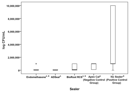 Figure 3. Distribution of quantitative values of each sealer group. Groups sharing the same letters do not represent statistical differences. The “*” sign in the graph represents the extreme outlier value.