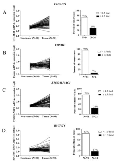 Expression levels of O-linked glycosyltransferases in CCA. The mRNA expression levels of (A) C1GALT1, (B) COSMC, (C) ST6GALNAC1, and (D) B3GNT6 in 90 paired CCA tissues were obtained from the GEO database (GEO series GSE76297).