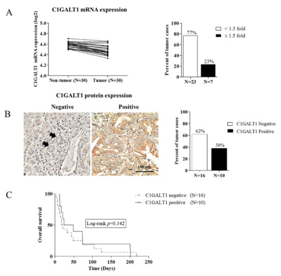 The synthesis of core 1-derived mucin-type O-glycans is a crucial precursor for the complex formation of mucin-type O-glycans []. We, therefore, verified the differential expression of C1GALT1 at both the mRNA and protein levels using qPCR and immunohistochemistry. The mRNA expression experiments demonstrated that there were 23% (7/30) of tumor cases showing a high expression of C1GALT1, whereas 77% (23/30) showed a low expression compared with the adjacent normal tissue using a cut-off value of 1.5-fold change (Figure 2A). This finding is consistent with the study of C1GALT1 protein expression in CCA tissues by immunohistochemistry, in which 38% (10/26) had positive expression while the remaining 62% (16/26) had negative expression (Figure 2B).