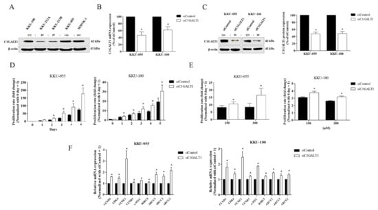 Core 1 β1, 3 galactosyltransferase I (C1GALT1) is a primary glycosyltransferase needed in the biosynthesis of mucin-type O-glycosylation. C1GALT1—with the aid of its C1GALT1-specific chaperone (COSMC)—transfers galactose to Tn-antigen (GalNAca-Ser/Thr) to form T-antigen (core 1 structure). T-antigen is further modified by adding other sugars via other glycosyltransferases to form the complex mucin-type O-glycans []. Dysregulation of C1GALT1 has been documented in various malignancies and has been linked to malignant phenotypes (i.e., cell proliferation and metastasis) and chemotherapeutic drug sensitivity [,,,]. The truncation of O-glycan has been associated with the genetic and epigenetic alterations of both C1GALT1 and COSMC, their specific chaperone [,,]. Loss of C1GALT1 in Kras and p53 mutant mice demonstrates the development of aggressive pancreatic ductal adenocarcinomas (PDACs) and increased metastasis. Additionally, knocking out C1GALT1 increases the truncation of O-glycosylation on MUC16, leading to increased tumorigenicity and PDAC aggressiveness []. A similar observation was reported in gastric cells, in which loss of C1GALT1 activity is the cause of gastritis and gastric cancer by caspase-1/caspase-11 (Casp1/11)–dependent inflammasomes []. Sagar et al. demonstrated that disruption of COSMC contributes to an increase in truncated O-glycans on MUC4, which enhances gemcitabine resistance in PDAC tumors by altering ErbB/AKT signaling []. C1GALT1 over-expression—associated with tumor growth, metastasis, and poor prognosis—has been observed in various cancers—viz., ovarian cancer [], head and neck cancer [], hepatocellular carcinoma [], breast cancer [], colorectal cancer [], and gastric cancer []. Silencing C1GALT1 expression inhibits cancer progression by blocking O-glycan elongation on several growth receptors—e.g., EGFR [], MET receptor [], FGFR2 [], β1-integrin [,,]. Taken together, dysregulation of C1GALT1 is involved in cancer development and progression by promoting either O-glycan truncation or elongation. This evidence motivated us to explore the significance of C1GALT1 in CCA. We sought to determine C1GALT1 expression in CCA tissues and CCA cell lines. The biological effects of C1GALT1 on CCA cell growth, 5-fluorouracil sensitivity, and its underlying mechanism were studied.