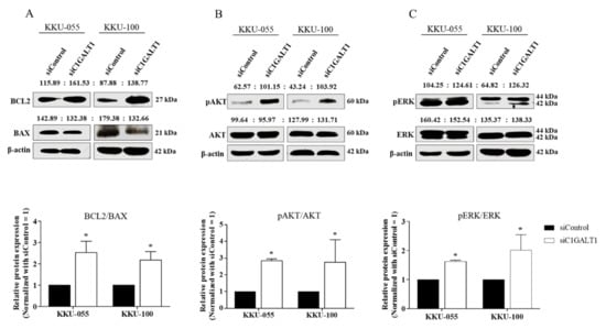 In order to evaluate the underlying mechanism involved in silencing C1GALT1-mediated CCA progression, C1GALT1 expression was suppressed using siC1GALT1 or siControl in KKU-055 and KKU-100 cells, and survival markers including BCL2, AKT, and ERK were determined. First, western blot analysis confirmed up-regulation of anti-apoptotic protein (BCL2) and down-regulation of apoptotic protein (BAX) after C1GALT1 suppression (Figure 4A). Then, the effect of silencing C1GALT1-mediated CCA survival was demonstrated by a high ratio of BCL2/BAX (Figure 4A). The activation/phosphorylation of AKT and ERK was significantly increased in silenced C1GALT1 cells (Figure 4B,C). These findings indicate that inhibition of C1GALT1 induces AKT/ERK activation, leading to CCA cell growth and survival.