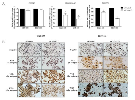 C1GALT1-knockdown was performed using small interfering RNA (siRNA) in the CCA cell lines, KKU-055, and KKU-100. The cells—at a density of 2.5 × 105 cells/well—were seeded into a 6-well plate and incubated overnight. According to the manufacturer’s protocol, cells were transfected with 10 µM siControl or siC1GALT1 using DharmaFECT® transfection reagent. After transfection for 48 h, transfected cells were used for determining C1GALT1 mRNA and protein expression and subsequent experiments.