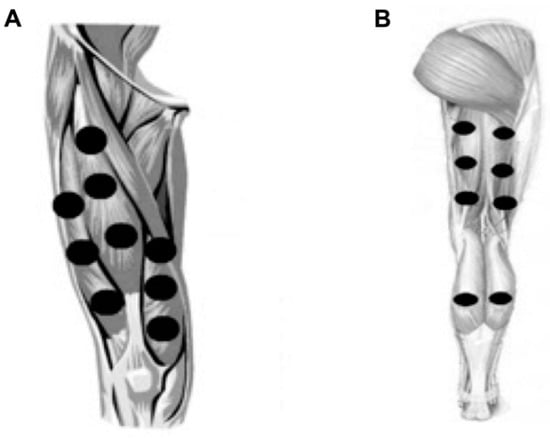 A single application of different doses of PBMT–SMF was administered after the baseline pre-intervention evaluation. In each stage, the patients received different doses of PBMT–SMF according to previous randomization (sham, 10 J, 30 J, and 50 J); at the end of the stage, the primary and secondary outcomes were assessed. A washout of one week was performed between one dose and another, and this washout was one week. Recent studies [23,28] determined that the technology of the equipment we used in the present study demonstrated that the ergogenic effects do not last longer than 54 h after irradiation; therefore, the 7-day washout used in the present study was adequate. PBMT–SMF was administered in direct contact with the skin and applied with slight pressure at nine sites on the knee extensors (Figure 1A), six sites on the knee flexors, and two sites on the plantar flexor muscles (Figure 1B), on both lower limbs.
