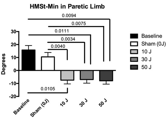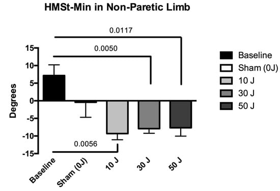 The results of kinematic gait variables under different conditions are summarized in Table 4. The dose of 30 J showed statistically significant improvements in the variable HMST–MAX in the paretic limb (p < 0.05), compared with the baseline value, and the doses of 30 J and 50 J showed statistically significant improvements in the variable HMST–MAX in the paretic limb (p < 0.05), compared with sham (Figure 3). In the non-paretic limb, statistically significant differences were also found in the variable HMST–MAX at doses of 10 J, 30 J, and 50 J (p < 0.05), compared with the baseline values (Figure 4). The 10 J, 30 J, and 50 J doses showed statistically significant improvements in the variable HMST–MIN in the paretic limb (p < 0.05), compared with the baseline value and sham (Figure 5). In the non-paretic limb, statistically significant differences were also found in the variable HMST–MIN at doses of 10 J, 30 J, and 50 J (p < 0.05), compared with the baseline value (Figure 6). The other variables of kinematic gait showed no significant differences (p > 0.05) in the comparative analysis of treatment doses, compared with baseline (Table 4). None of the patients reported any adverse events.