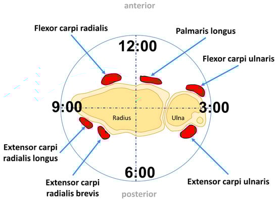 Wrist muscles position from a distal to proximal view.