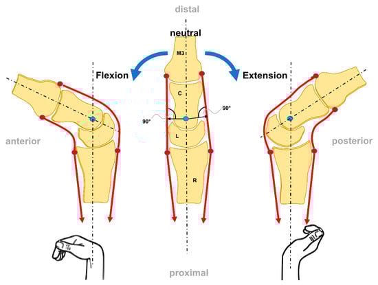 On the posterior side are three primary wrist extensor muscles: the extensor carpi radialis longus (ECRL), extensor carpi radialis brevis (ECRB), and extensor carpi ulnaris (ECU) (Table 3). They have larger moment arms about the wrist axes [33]. The flexion is mainly produced by the PL, FCU, and FCR. The motion is supported by the flexor digitorum superficialis muscle. The extension is mainly produced by the ECRL, ECRB, and ECU. They will be assisted from the extensor digitorum muscle. The adduction is produced by the ECU and FCU. The abduction is produced by the FCR, ECRL, and ECRB. It is supported by the abductor pollicis longus muscle.