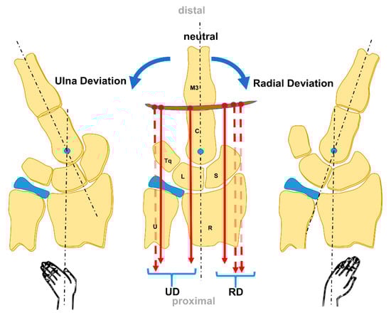 The PCR bones come along with a unique motion pattern. The PCR moves together with a higher motion between the individual bones than between the DCR [41]. The lunate shows the least range of motion (ROM), followed by the triquetrum and scaphoid. The PCR bones flex during global wrist flexion and extend during global wrist extension. In case of global wrist extension, the scaphoid shows the tendency to supinate and the lunate to pronate. A reverse phenomenon occurs during global wrist flexion. In case of global wrist RUD, the PCR bones demonstrate a unique motion behaviour that is best described as reciprocal [2,43]. Radial deviation leads to palmar flexion and secondarily and variably counter−rotation of the PCR bones toward the ulnar margin of the wrist. Ulnar deviation leads to a principal extension and secondarily and variably counter rotation toward the radial margin of the wrist. The same longitudinal motion behavior take place between the PCR bones during RUD as occurs during wrist FE. Therefore, the PCR bones accommodate wrist RUD by palmarflexing and dorsiflexing, respectively [2,44].