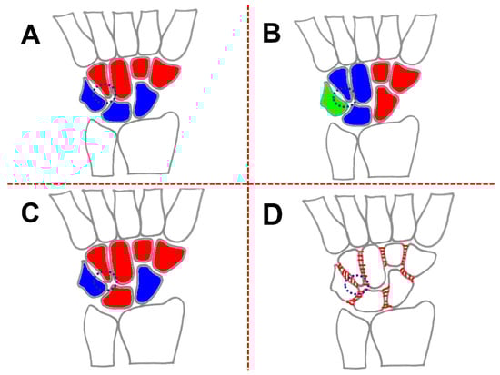 - Tang, P.; Wei, D.H.; Ueba, H.; Gardner, T.R.; Rosenwasser, M.P. Scaphoid Excision and 4-Bone Arthrodesis Versus Proximal Row Carpectomy: A Comparison of Contact Biomechanics. J. Hand Surg. 2012, 37, 1861–1867. [Google Scholar] [CrossRef]