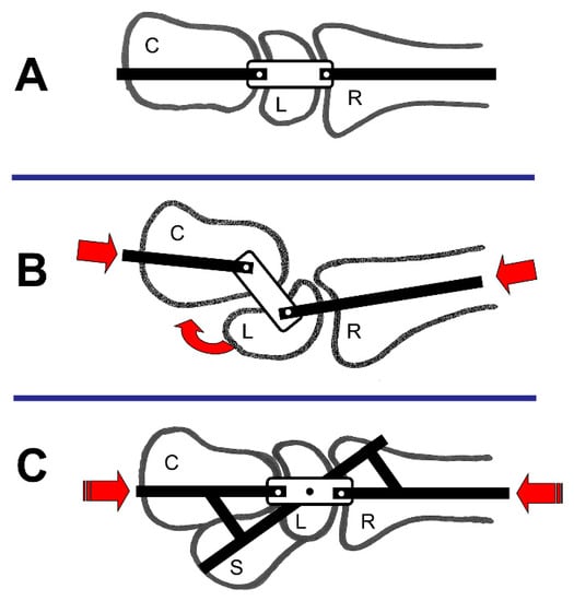 Link joint theory; S = scaphoid, L = lunate, C = Capitate, and R = Radius; (A) General constitution; (B) Load applied on the wrist; (C) Stabilisation of the wrist joint (modified after [10,50]).