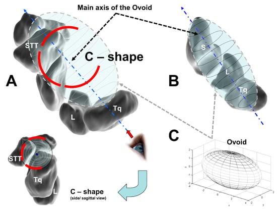 The Ovoid/C–shape theory; (A) L = lunate, and Tq = triquetrum, schematic of the dorsodistal view of the midcarpal ovoid with which the scaphotrapeziotrapezoid (STT) joint is in contact; (B) S = scaphoid, separated view of the Ovoid; (C) Ovoid in 3D (modified after [50]).