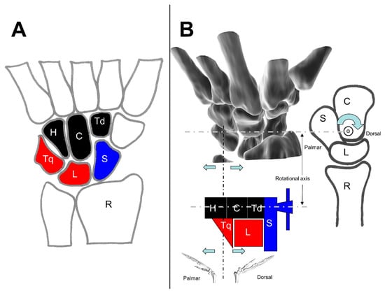 Navarro postulated that there exists a central, or FE column. The FE column includes the lunate, the capitate, and the hamate; the lateral column, or mobile column, includes the scaphoid, the trapezium, and the trapezoid; and medial column, or rotation column, consists of the triquetrum and pisiform [10,22,49]. The columnar carpus is demonstrated in Figure 5B. Furthermore, in this theory, the scaphoid and the triquetrum are considered independent parts of a complex carpal mechanism [22]. The triquetrum is important, particularly its articulation with the ulnar bony facet of the hamate, which is shaped to favor helicoidal or rotatory movements [22,49].