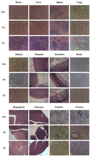 | Female rats | CK | 43.0 ± 6.5 | 89 ± 19 | 65.9 ± 10.5 | 26.6 ± 4.1 | 71 ± 17 | 8.42 ± 1.71 | 9.00 ± 0.90 | 47.6 ± 11.6 | 2.77 ± 0.79 | 0.57 ± 0.25 | 3.04 ± 0.93 | 968 ± 333 | 4.49 ± 0.29 | 139.9 ± 1.5 | 107.7 ± 3.2 |