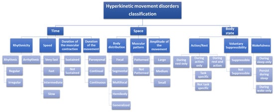 Hyperkinetic movement disorders can be categorized according to different cardinal features [7,8], which describe the movement in terms of (Figure 1): time, space distribution, and body state’s impact.