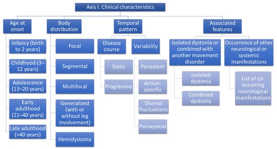 Dystonia is a hyperkinetic movement disorder characterized by sustained or intermittent muscle contractions causing abnormal movement or posture. Dystonia has distinct clinical features; however, a wide spectrum of phenomenological presentations may be recognized. Dystonia can present in isolation or in combination with other movement disorders like chorea, myoclonus, tremor, and parkinsonism [1]. Dystonia is one of the most underdiagnosed and misdiagnosed movement disorders. The most common misdiagnosis is between [2]: dystonic tremor and essential tremor, parkinsonian tremor, or psychogenic tremor; dystonic jerks and myoclonus; tic-like dystonia and Tourette syndrome. To aid clinicians in reaching the proper diagnosis, several classifications have been proposed over time. The first classification of dystonia was presented in 1976 [3], and during subsequent years it was modified several times [4,5,6]. The last classification was proposed in 2013 and distinguishes two main axes: axis 1, clinical characteristics, and axis 2, etiology [1]. The classification of dystonia in a single patient should be considered as a dynamic process, subject to re-evaluation in the light of the progression of clinical history and new advances in dystonia research.