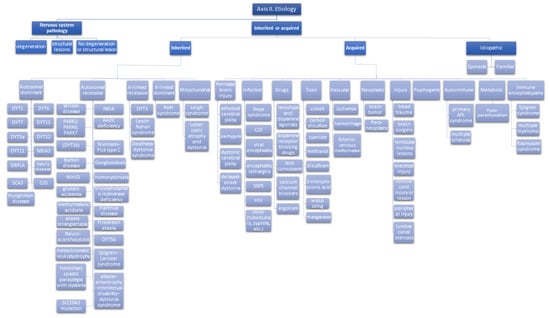 This classification can guide further testing for etiology identification since dystonia can be a manifestation, for example, of some degenerative parkinsonism, such as progressive supranuclear palsy (PSP) [29] and corticobasal degeneration (CBD) [30,31], and also of some genetic forms characterized by a combination of different movement disorders (Figure 2).