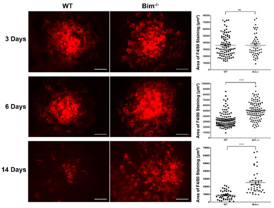 Figure 1. Decreased resolution of F4/80 cells in the absence of Bim expression. Choroidal neovascularization was induced in 3-month-old wild-type (WT) and Bim -/- mice by laser-photocoagulation-induced rupture of Bruch’s membrane. At 3, 6, and 14 days following laser photocoagulation, the eyes were sectioned at the equator and the anterior half with the vitreous and retina discarded. The remaining RPE/choroid complex was stained with anti-F4/80, and the positive staining area quantified (ns; not significant; **** p < 0.0001). Each point represents one laser spot. Scale bar = 100 µm. These experiments were repeated with at least 8 mice of each genotype.