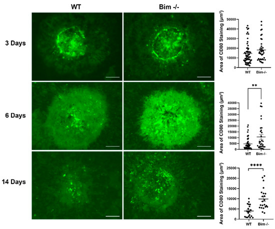Figure 4. Decreased resolution of CD80-positive cells in RPE/choroid from Bim -/- mice. Three-month-old wild-type and Bim -/- mice underwent laser photocoagulation. The choroid RPE/choroid complex was harvested after 3, 6, and 14 days, wholemount stained with anti-CD80, and the positive staining area was quantified. Each point represents one laser spot. These experiments were repeated with at least 8 mice of each genotype. Scale bar = 100 µm. (** p < 0.01, **** p < 0.0001).