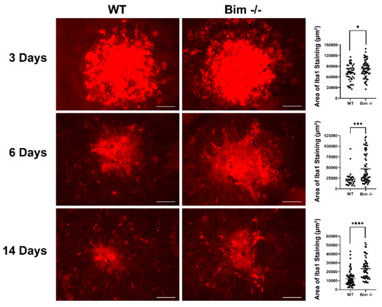Figure 5. Global lack of Bim expression increased Iba1-positive cells. Wild-type and Bim -/- mice (3-month-old) underwent laser photocoagulation, and the RPE/choroid was harvested 3, 6, and 14 days later. The RPE/choroid was wholemount stained with anti-Iba1 and the positive staining area was quantified. Each point represents one laser spot. These experiments were repeated with at least 8 mice from each genotype. Scale bar = 100 µm. (* p < 0.05, *** p < 0.001, **** p < 0.0001).