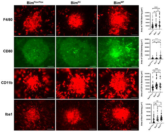 Figure 7. Mice conditionally lacking Bim expression in MPs have decreased resolution of F4/80-, CD80-, CD11b-, and Iba1-positive cells. To assess the role Bim expression plays in moderating the immune response during CNV, 3-month-old BimFlox/Flox, BimEC, and BimMP mice underwent laser photocoagulation. Six days later, the RPE/choroid was wholemount stained with anti-F4/80, anti-CD80, anti-CD11b, or anti-Iba1, and the area of positive staining was quantified (on the right). Each point represents one laser spot. Experiments were performed with at least 8 mice for each condition. Scale bar = 100 µm. (ns; not significant; **** p < 0.0001, *** p < 0.001, ** p < 0.01).