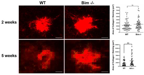 Figure 8. Increased collagen I in the absence of Bim. To assess the amount of scarring, the RPE/choroid from wild-type and Bim -/- mice was wholemount stained with anti-collagen I, 2 and 5 weeks following laser photocoagulation. The area of collagen staining was quantified (on the right). Each point represents one laser spot. At least 8 mice for each condition were used. Scale bar = 100 µm. (ns; not significant; ** p < 0.01).