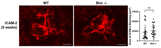 Figure 9. Similar level of CNV was noted 5 weeks following laser photocoagulation in and wild type and Bim -/- mice. Wild-type and Bim -/- mice (3-month-old) underwent laser photocoagulation. Five weeks later, the RPE/choroid was harvested, wholemount stained with anti-ICAM-2, and the area of staining quantified. Each point represents one laser spot. At least 8 mice for each condition were used. Scale bar = 100 µm. (ns; not significant).