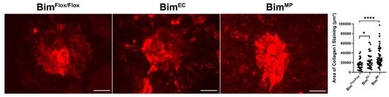 Here, our studies demonstrated that a global lack of Bim expression diminished MP resolution and enhanced ongoing scar formation (5 weeks post laser photocoagulation), without a significant impact on CNV. While BimMP mice had reduced MP resolution for all markers examined, BimEC mice had reduced resolution of only CD11b- and Iba1-positive staining cells. To assess scar formation, BimFlox/Flox, BimEC, and BimMP mice underwent laser photocoagulation followed by wholemount staining of the choroid/RPE with anti-collagen I after 5 weeks. Figure 10 demonstrates enhanced scar accumulation in both BimEC and BimMP mice 5 weeks following laser photocoagulation, with BimMP mice demonstrating the highest amount (BimFlox/Flox 15,991 ± 1615 vs. BimEC 24,657 ± 2409 vs. BimMP 31,074 ± 2327; * p < 0.05, **** p < 0.0001). Thus, the inability to clear MPs in the absence of Bim is associated with the enhanced severity of scar accumulation.