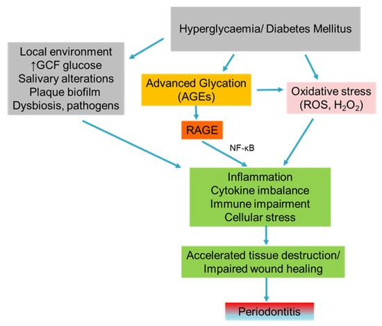 Sequences of events that lead to periodontitis in hyperglycemic or diabetic conditions mediated by increased levels of AGEs and oxidative stress in combination with periodontal pathogens.