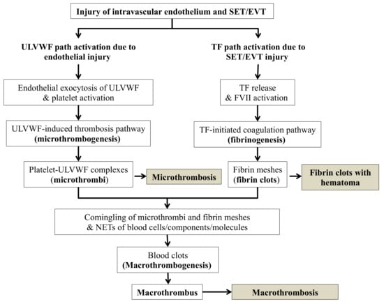 The character of macrothrombus is clearly different from that of microthrombi with dissimilar hemostatic components, and each expresses distinct clinical and pathologic phenotypes. In essence, microthrombi are composed of platelet-ULVWF complexes resulting from disseminated endotheliopathy in the microvasculature, and macrothrombus is made of the combined product of microthrombi, fibrin meshes and NETs of various blood cells, components and molecules at the region of local vessel injury site. A local arterial or venous vascular wall injury (e.g., trauma) triggers localized release of ULVWF multimers from ECs and TF from SET into the intravascular space. ULVWF multimers become anchored to local endothelial membrane and recruit the platelet, and activate ULVWF path of hemostasis. Separately, TF activates FVII to initiate TF path of hemostasis. The former produces localized microthrombi strings composed of the platelet-ULVWF complex via microthrombogenesis and the latter produces fibrin meshes composed of the thrombin-fibrin complex via fibrinogenesis, in which the unifying process of microthrombi strings and fibrin meshes form a localized macrothrombus via macrothrombogenesis. This localized macrothrombosis in the venous system becomes distal DVT [16,18,30].