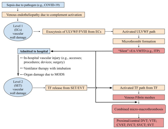 Accordingly, at least two characters of venous thrombosis occur; one is local trauma causing solitary and localized macrothrombotic DVT (i.e., distal DVT), and the other is venous endotheliopathy producing asymptomatic and “silent” but “transient” disseminated microthrombosis leading to consumptive thrombocytopenia via microthrombogenesis (i.e., ITP-like syndrome). Then, a next question is what is the pathogenesis of multiple, large and extended macrothrombotic DVT (i.e., VTE). According to the unifying mechanism of hemostasis in vivo, asymptomatic vEA-VMTD can be transformed to inexplicably “serious” VTE if a septic patient is complicated by additional in-hospital related vascular injury [4,18]. Surgery, vascular access, vascular device, and ventilator support with tracheal intubation as well as incidental in-hospital trauma can lead to vascular wall damage, which unlike distal DVT can trigger “venous combined micro-macrothrombosis” characterized by laboratory data showing activated ULVWF path with increased release of ULVWF and FVIII and activated TF path with markedly elevated D-dimer.