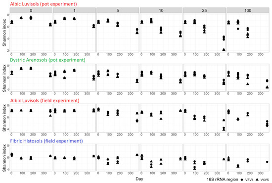 Alpha-diversity estimated by the Shannon index at the ASV level. The numbers above the histograms represent the initial kerosene loads, in g/kg. 16S rRNA regions are shown by the dot (V3V4) and triangle (V4V5).