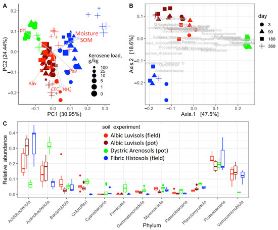 Differentiation of the studied soils in the pot and field experiments: (A) principal component analysis (PCA) of the soil chemical properties; (B) principal coordinate analysis (PCoA) of the microbiome composition based on weighted UNIFRAC as a metric; (C) the relative abundance of the top 12 most frequent phyla among all uncontaminated samples in all experiments (all time points). The soil is shown by the color: (dark) red, Albic Luvisols; green, Dystric Arenosols; blue, Fibric Histosols. The microbial composition was estimated using the V3V4 region of 16S rRNA gene.