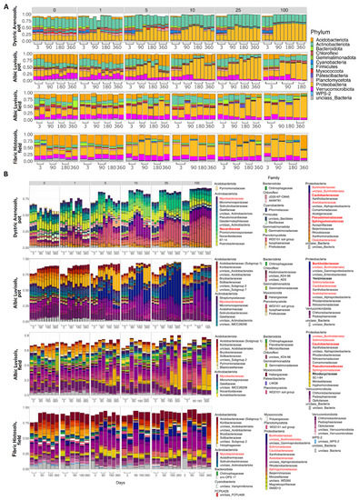 In untreated Albic Luvisols and Fibric Histosols from the field experiment, only weak seasonal variability was observed in the microbiome composition (Figure 2C and Figure 3).