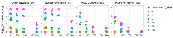 Indeed, the content of kerosene continuously decreased, with a more rapid and pronounced decline in the field experiment (Figure 4). Even only 3 days after pollution of Albic Luvisols, the observed kerosene concentration under the same loads was 1.5–4-fold higher in the pot experiment than in the field experiment (Supplementary Table S3), implying a more intensive soil self-restoration of volatile hydrocarbons in natural conditions. After 90 and 180 days, the concentration dropped by up to several orders of magnitude from the initial level in all samples from the field experiment, whereas in the pot experiment, it showed a slow decline in moderately contaminated samples and only a slight decrease in highly contaminated ones. After a year, in the samples with initial loads of 10 g/kg or less, kerosene was detected in negligible concentrations (<0.1 g/kg) in all soils. In the samples with higher initial loads, kerosene was almost not detectable in Fibric Histosols and reached approximately 0.1–0.3 g/kg (initial load of 25 g/kg) and 0.3–1.1 g/kg (initial load of 100 g/kg) in the Albic Luvisols samples from the field experiment. The samples of the laboratory pot experiment with high initial kerosene loads maintained higher kerosene concentrations.