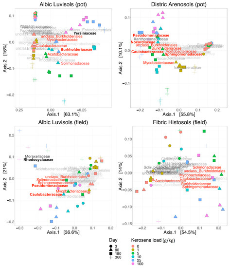 Principal coordinate analysis (PCoA) plots for soils with different initial kerosene loads. The load in g/kg is shown by the dot color, and the day after kerosene treatment is shown by the dot shape (see legend). The beta-diversity is estimated by the weighted UNIFRAC metric (the V3V4 16S rRNA region). The names of the most abundant bacterial families mark the main shifts in the soil microbial composition. The families whose relative abundance increased after kerosene pollution in all, or almost all, soils are in red. Dominant families whose relative abundance increased after kerosene pollution in a specific soil type and experimental setup are in boldface. The PCoA for the V4V5 region and for Bray–Curtis dissimilarity are in Supplementary Figures S8–S11.