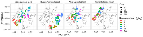 In the pot experiment, the samples collected on the third day after kerosene treatment formed a dense cluster with smaller mean beta-diversity between samples with different kerosene loads, as compared to the field experiment (Figure 5 and Figure S4). This discrepancy might result from several causes. All pot microbiomes could be highly and similarly stressed by the soil preparation procedure and environmental change, while the DNA of bacteria that died immediately following the kerosene pollution could be preserved longer as the surviving bacteria were suppressed and inactive. On the other hand, in the field experiments, the bacterial community could react actively to the kerosene treatment as some soil microcompartments might be uncontaminated and bacteria could migrate naturally. However, these differences were relatively small and statistically significant in the pot experiment and insignificant in the field one. The cause might have lain in the small number of samples and a high diversity between those from the same group in the field experiment (Supplementary Table S5).