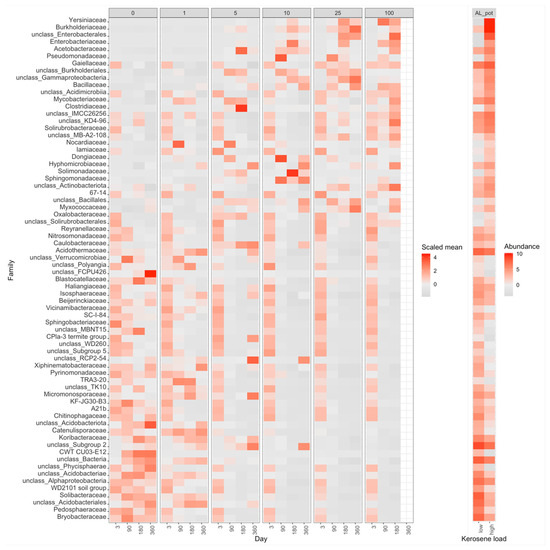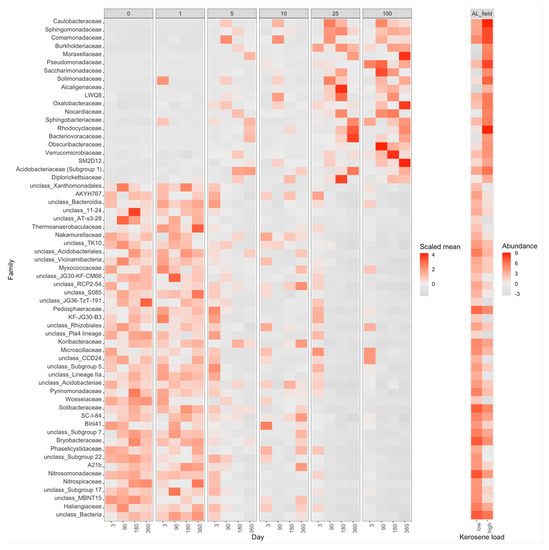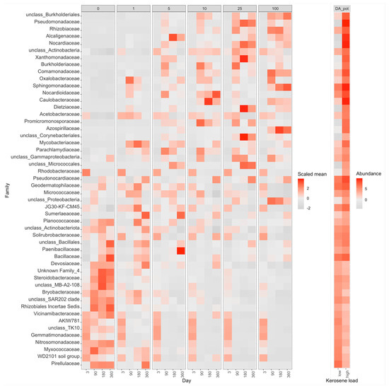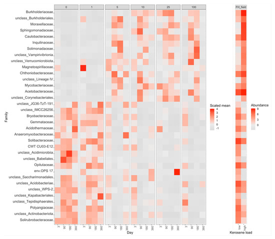 Heatmap with the relative abundance of bacterial families with the significant difference between the highly contaminated (kerosene load = 25 or 100, day > 3) and control (kerosene load = 0, day > 3) samples of Albic Luvisols, the field experiment. Notation as in Figure 7. The V3V4 data are shown, a similar heatmap for the V4V5 region is shown in Supplementary Figure S22.